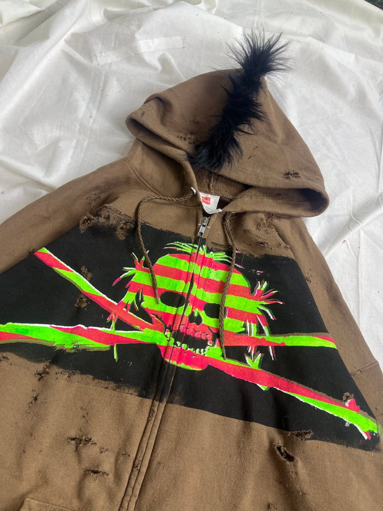 screenprinted cotton hoodie, distressed, patched, mohawk added
