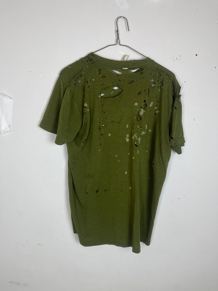 The t-shirts I use are thrifted, so every pieces are all slightly different. Handmade, screenprinted and hand distressed by me.