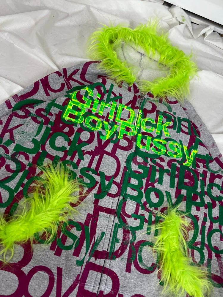 All over screenprint, front screenprint and fur sewn on the hood and each pockets.
