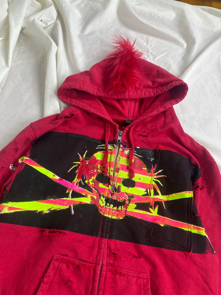 screenprinted cotton hoodie, distressed, patched, mohawk added