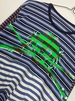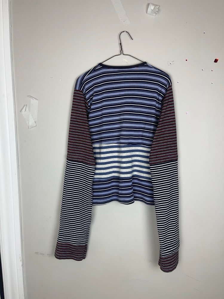 Handmade, screenprinted and hand distressed by me. Made from multiple different type of fabric, all the fabric used is thrifted. Crop + extra long sleeves.
