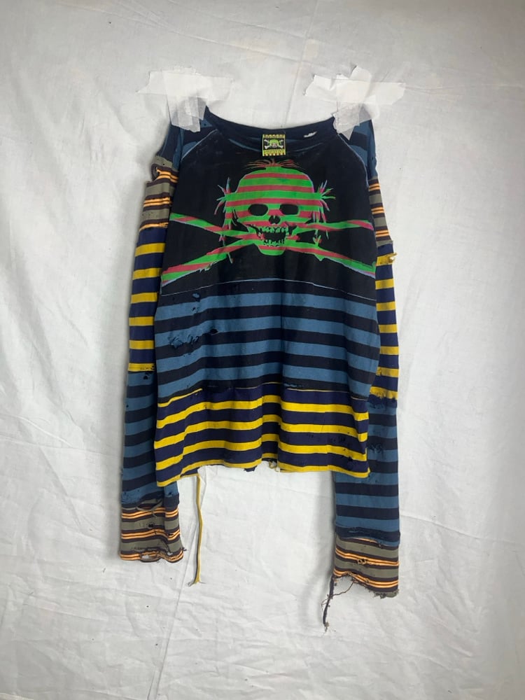 Made from multiple different thrifted striped fabrics, hand distressed, all cut and sewn and reconstructed, screenprinted front design, extra long sleeves