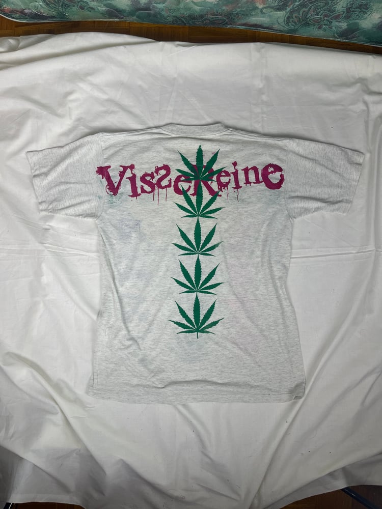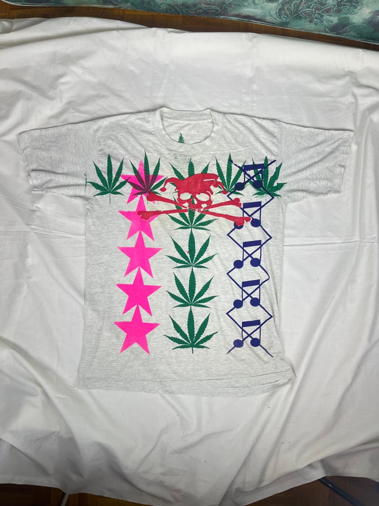 Single stitch vintage light gray cotton t-shirt, multilayer screenprint front + back