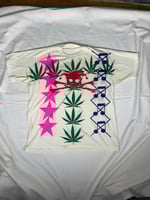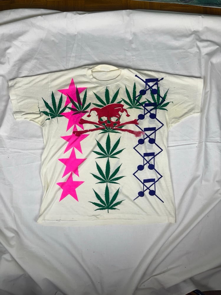 Paper thin, single stitch vintage white cotton t-shirt, multilayer screenprint front + back